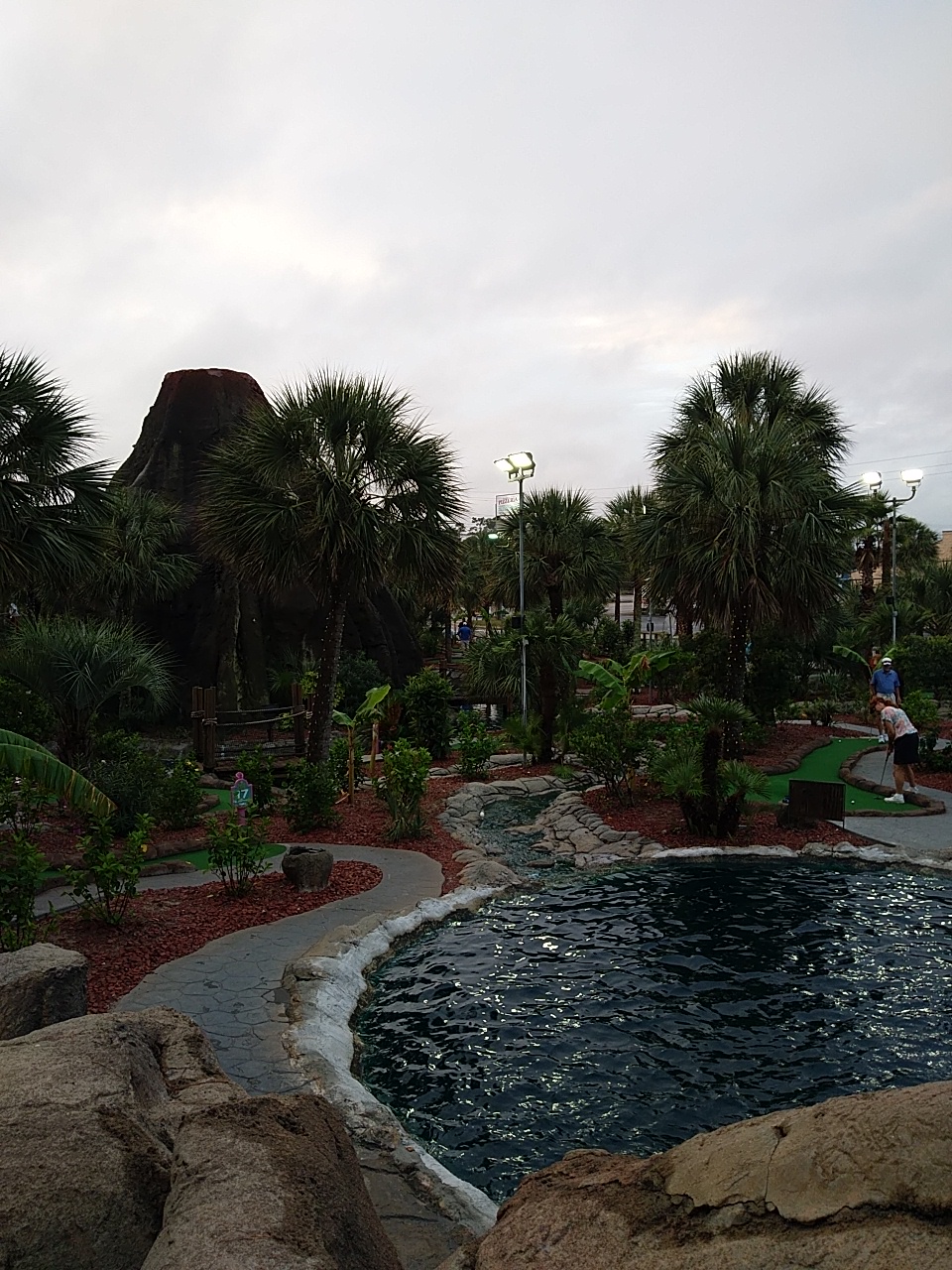 Fun course, very well designed. Greens were kept fresh - only noticed a couple blemishes. They had a nice collection of parrots to check out as you went inside the front entrance. The music playing at the course was fitting, a collection from Jimmy Buffet & Harry Belafonte. We were excited when thunder struck and the volcano erupted which happens every 1/2 hour or so. The course was on many different levels which gave you a great view at the highest one. There is a turtle and carp pool in the facility in which you could feed with food pellets. The one turtle that came buy wasn’t that interested but they were fun to watch. I thought 9$ a head was on the high end…but the location & atmosphere made up for it.