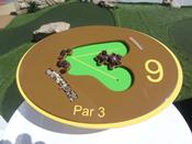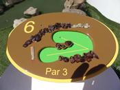 A nine hole course - Par 23. A mixture of Par 2 and Par 3 holes. Several of the Par2's are aceable. A couple of the Par3's are aceable also. Several of the Par2's are quite difficult requiring a great deal of touch and feel just to obtain Par. The course really bears it's teeth at sea with a swell running and wind blowing. The onboard tournaments are fun. With medals given out in the Gold, Silver and Bronze positions. These are normally held every couple of days. A score of below par is possible. I managed a couple of six under par rounds during the 2 week cruise. Best in tournament play a Gold medal winning 20. 3 under to win the Napier NZ mini golf open. See the You tube video at PuttPuttdownunder.